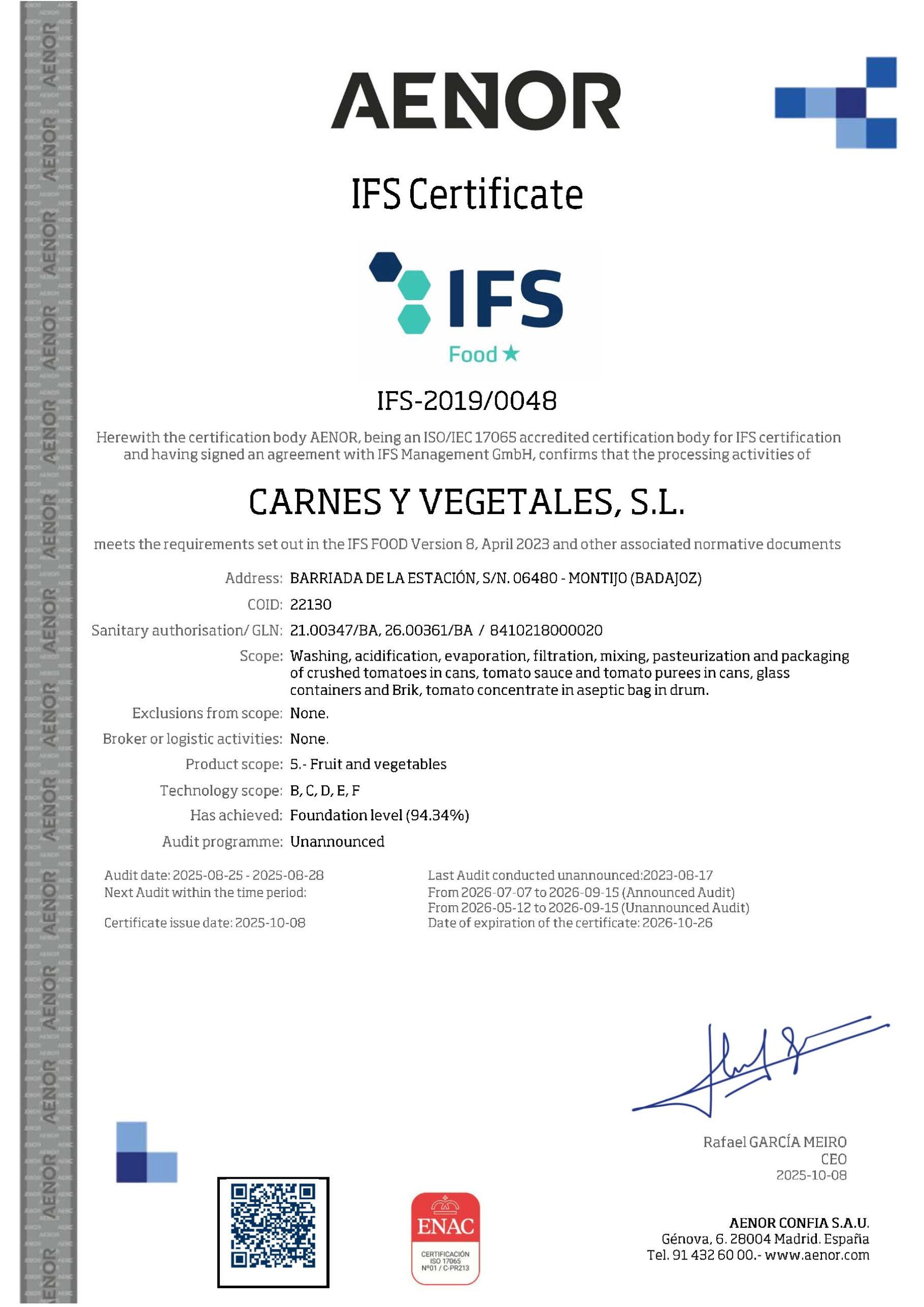 SR10 y otras normas nacionales, europeas e internacionales como es IFS, dentro de la cual se desarrolla un plan de protección del producto (Food Defense), y la norma de Marca Garantía Halal.