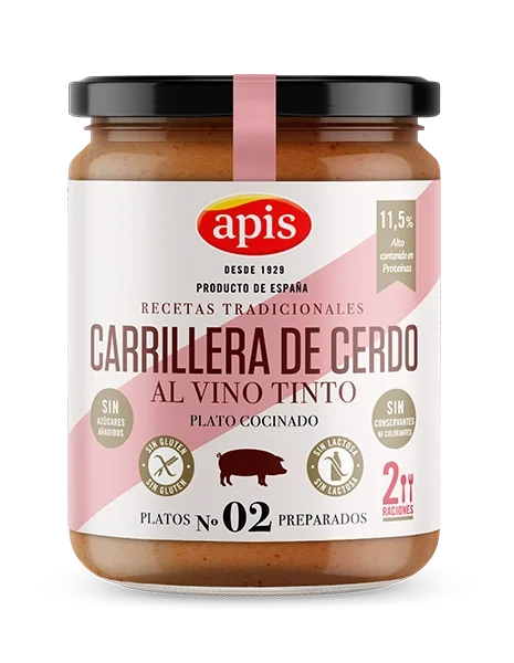 Pechuga de pollo (45%), champiñones (25%), cebolla, vino, aceite de oliva, agua, ajo, almidón modificado de maíz, sal, curry (0.1%) y especia.